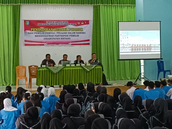 SINTANG – Badan Kesatuan Bangsa dan Politik Kabupaten Sintang melakukan Pendidikan Budaya Politik bagi Pemilih Pemula di Aula Madrasah Aliyah Negeri 1 Sintang pada Kamis, 14 November 2024.