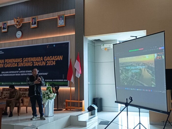 SINTANG – Nur Muhamad Gito Wibowo, Wakil Ketua Ikatan Ahli Rancang Kota Indonesia yang merupakan Anggota Dewan Juri pada Sayembara Desain Monumen Garuda Kabupaten Sintang Tahun 2024 dari profesi keahlian, menjadi narasumber pada Dialog Interaktif Lintas Stakeholder dengan tema “Gagasan Perencanaan Masa Depan Perkotaan Sintang” yang dilaksanakan oleh Bappeda Kabupaten Sintang pada Selasa, 19 November 2024, di Aula Bank Kalbar Cabang Sintang.